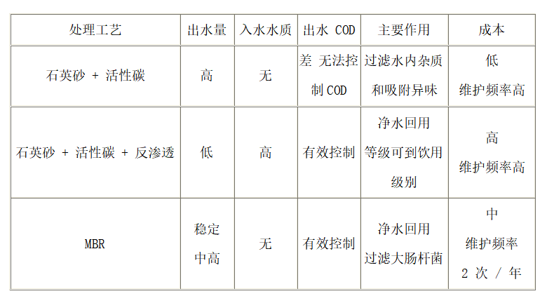 MBR 工藝優(yōu)勢:相對于以上兩種技術(shù), MBR工藝對入水水質(zhì)要求不高,通過預(yù)處理沉淀工藝,再加以一定的藥劑,可初步過濾水中大顆粒物質(zhì)及油污,達(dá)到預(yù)處理標(biāo)準(zhǔn)。再經(jīng)過我們的ESMBR設(shè)備的最終處理,可使出水水質(zhì)指標(biāo)達(dá)到國家關(guān)于洗車用水標(biāo)準(zhǔn), COD 降到 50 以內(nèi)。出水既可以用來洗車,也可以用來綠化、澆灌等。